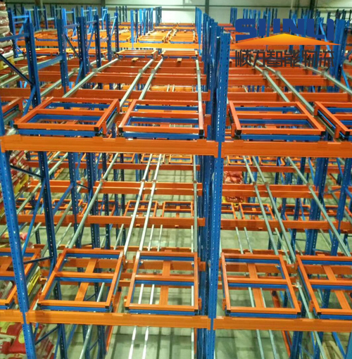 在前后梁间以多层台车重叠相接,从外侧将叠栈货物置于台车推入,后储存之货品会将原先货品推往里面材质:钢制